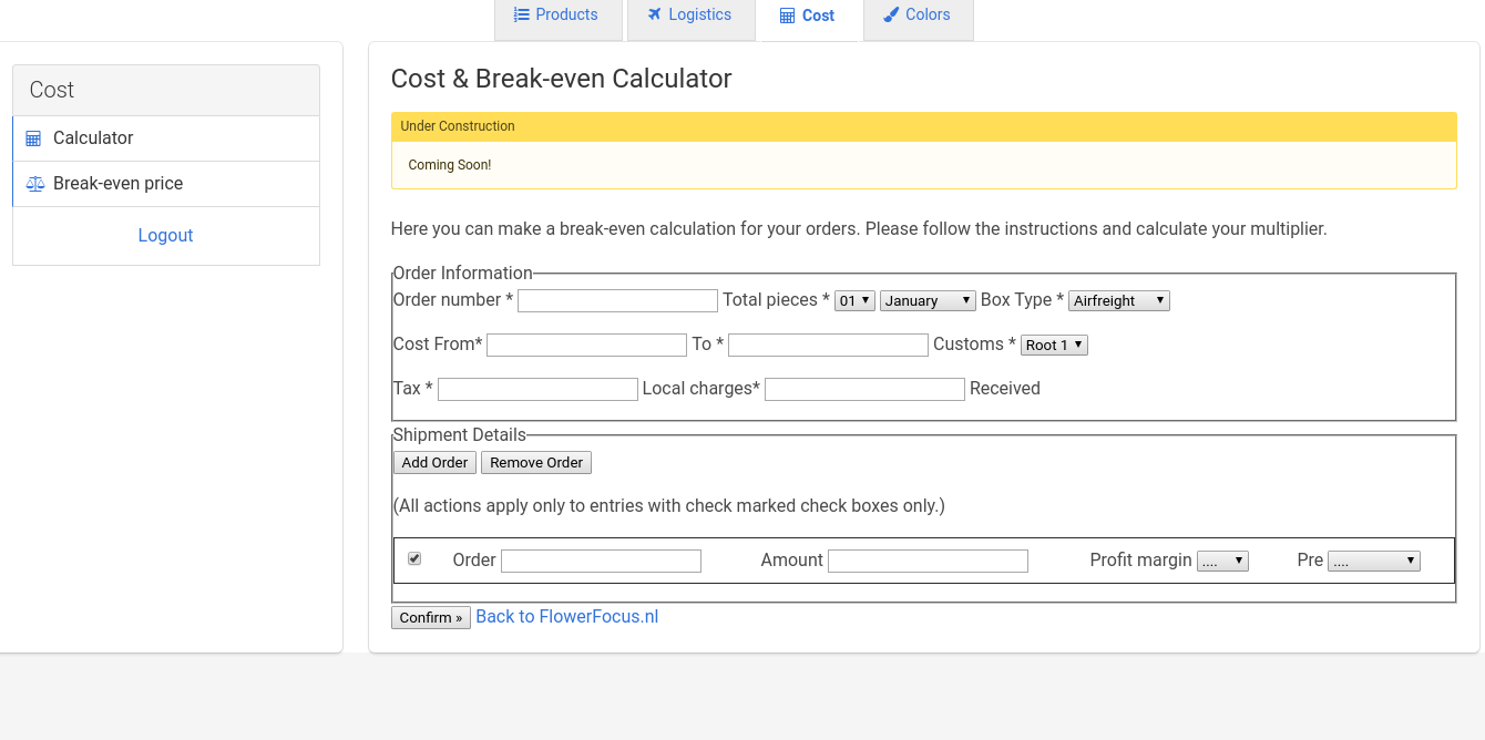 One of the most important but nevertheless least found calculators is how to calculate your cost-profit-margin. That is why we implemented a cost/break-even calculator. The clients can fill in some parameters and have their cost price and possible profit in a few seconds.